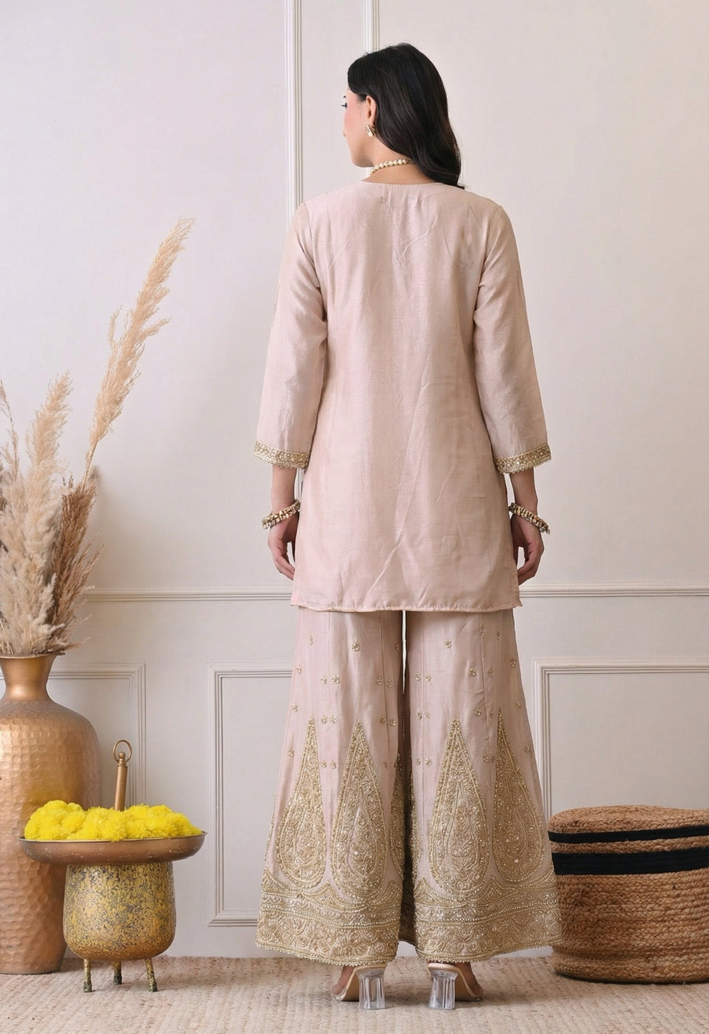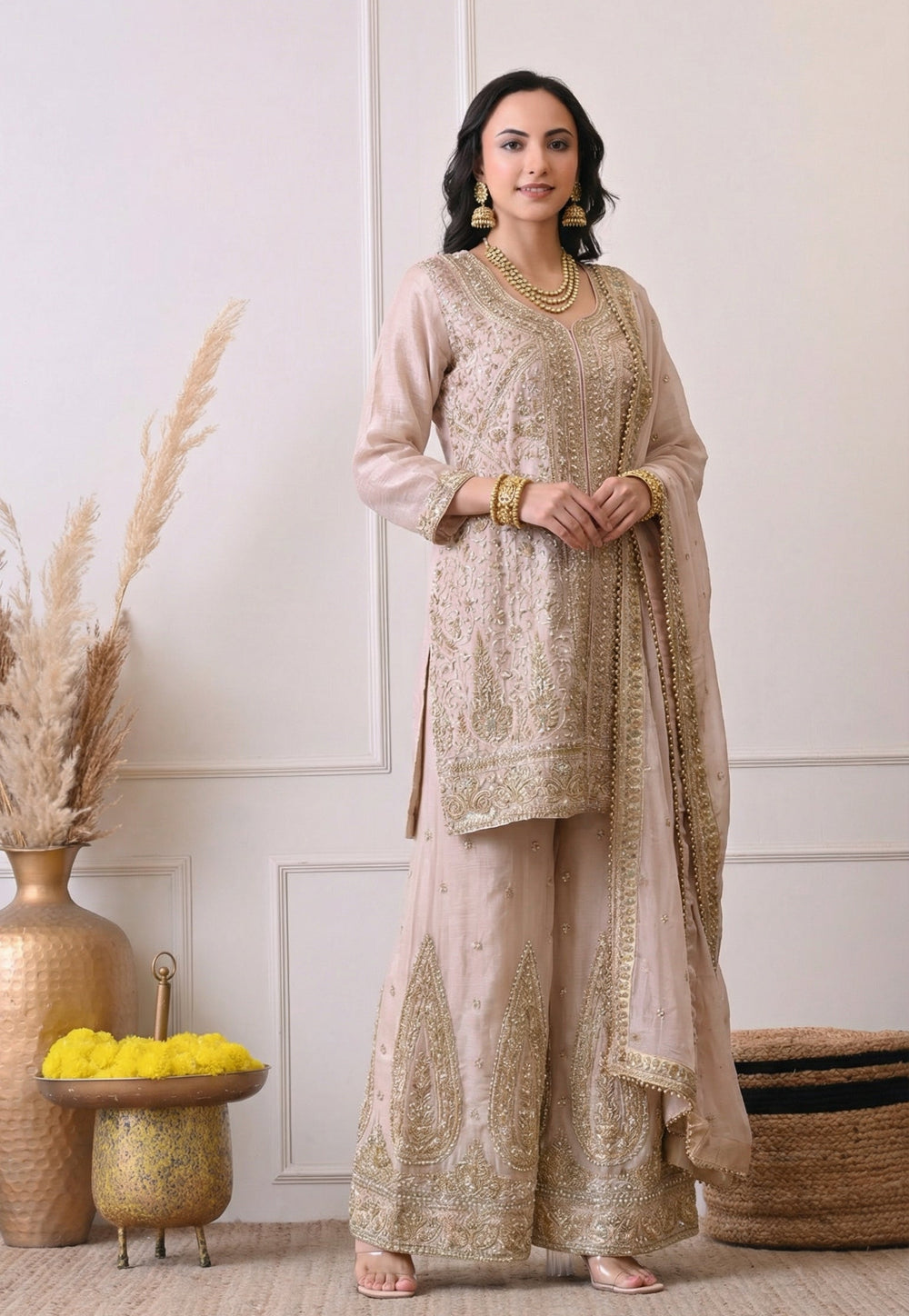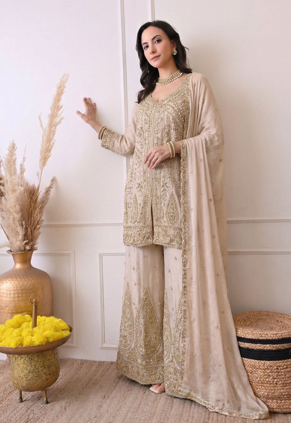 The suit is a beautiful show‑stopper. It is made of premium silk fabric and features Zari, Beads, Cutdana, and Sequin Embroidery, which look very luxurious. The kurta has a V‑neck and three‑quarter sleeves with detailed embroidery on the neck, front, and sleeves. The sharara also has beautiful Zari, Beads, Cutdana, Sequin Embroidery. The dupatta has motifs and embroidered borders. This masterpiece is perfect for grand occasions like weddings and reception parties.