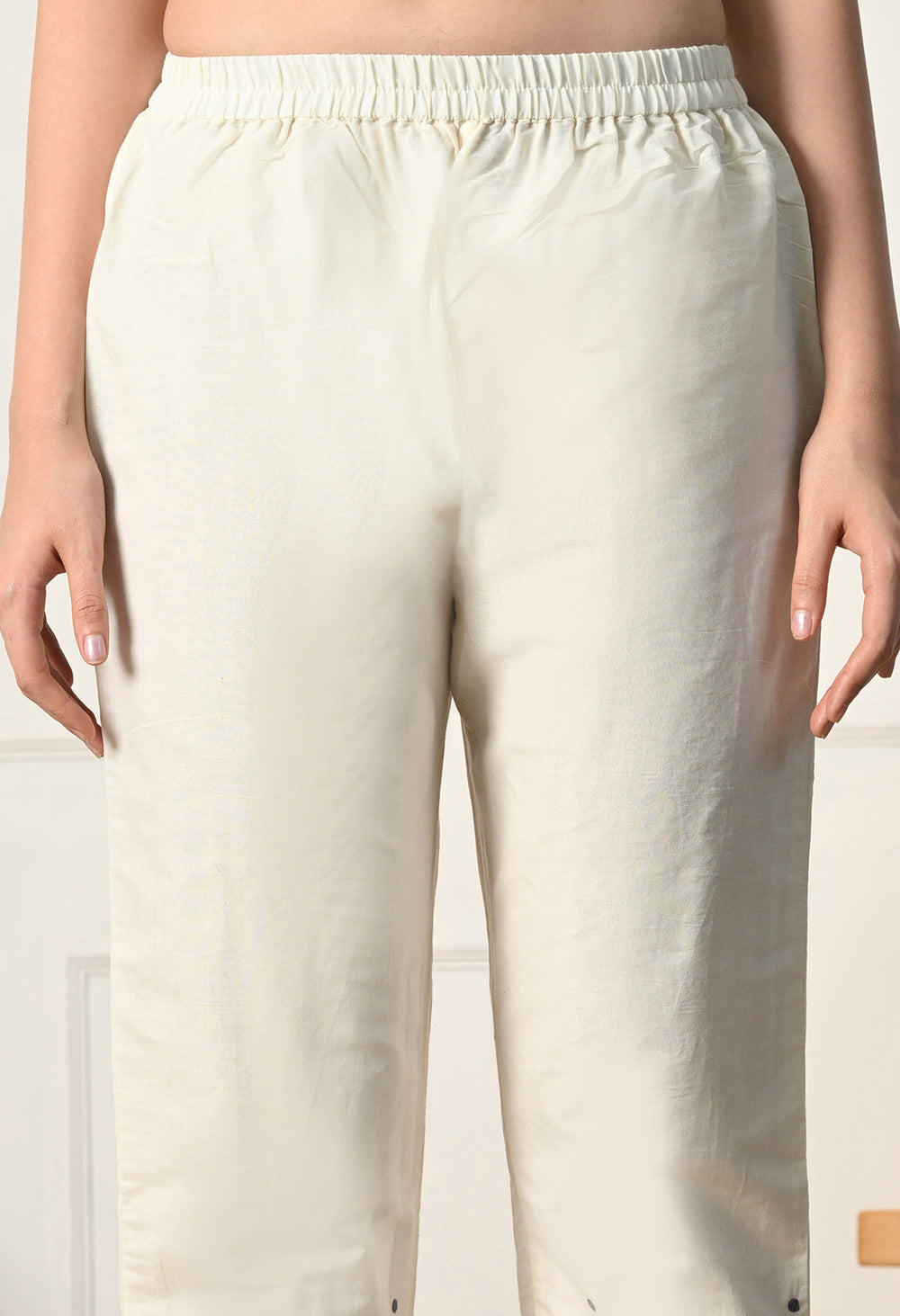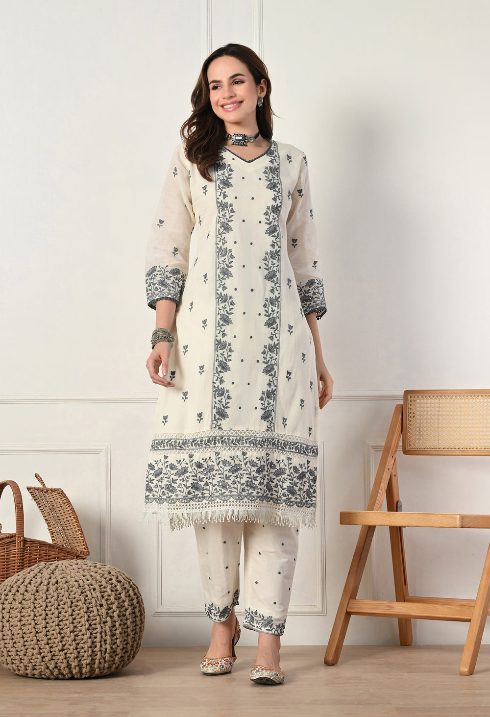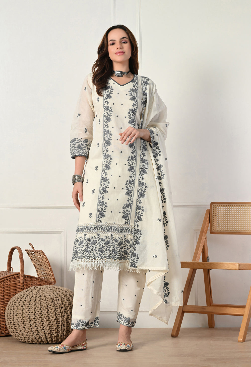Luxurious Cream Cotton Embroidered Suit- Set of 3