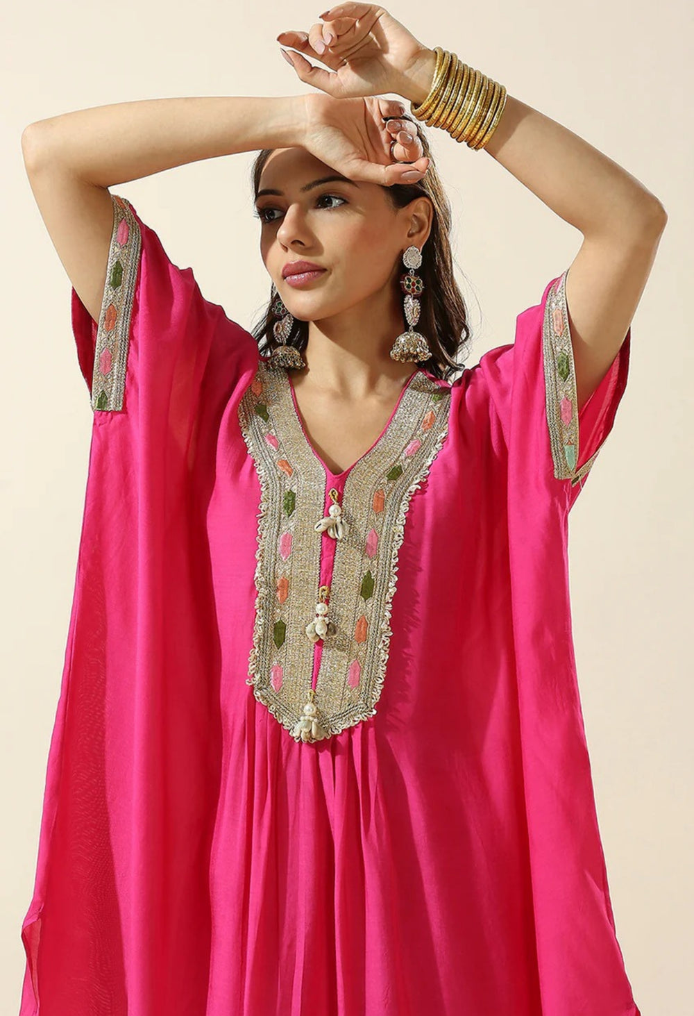 Fuchsia Pink Gota Patti Muslin Kaftan with Pants - Set of 2