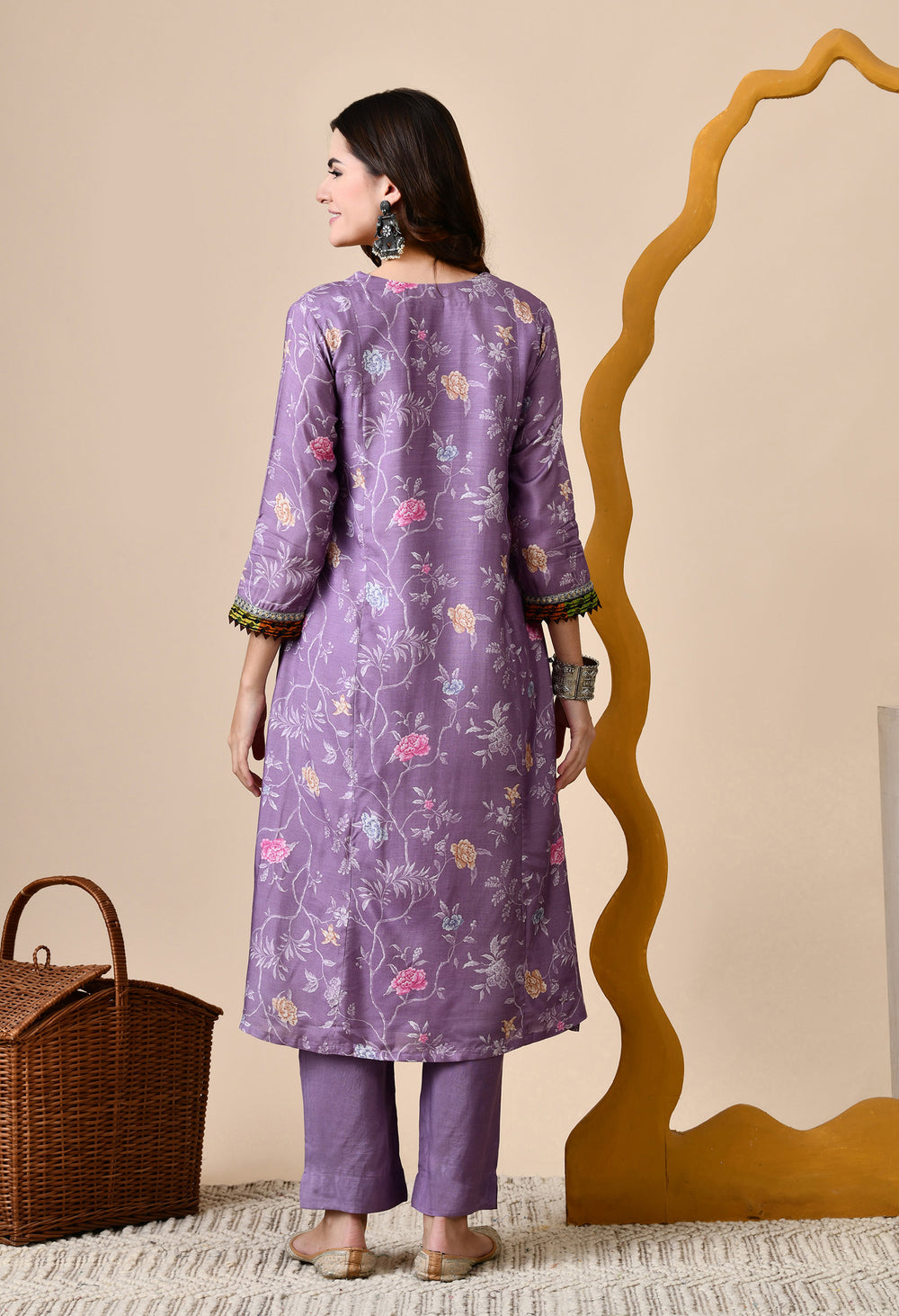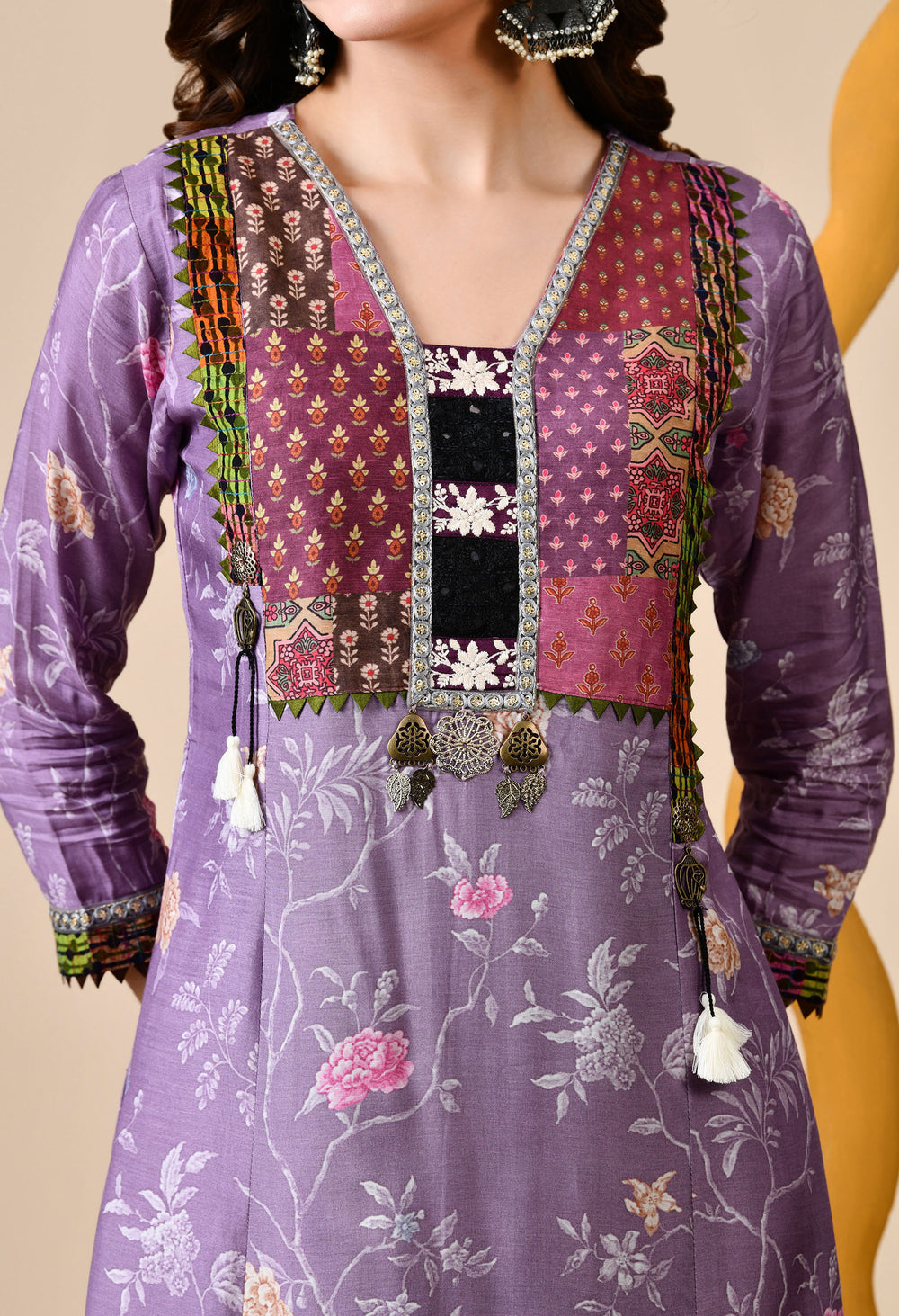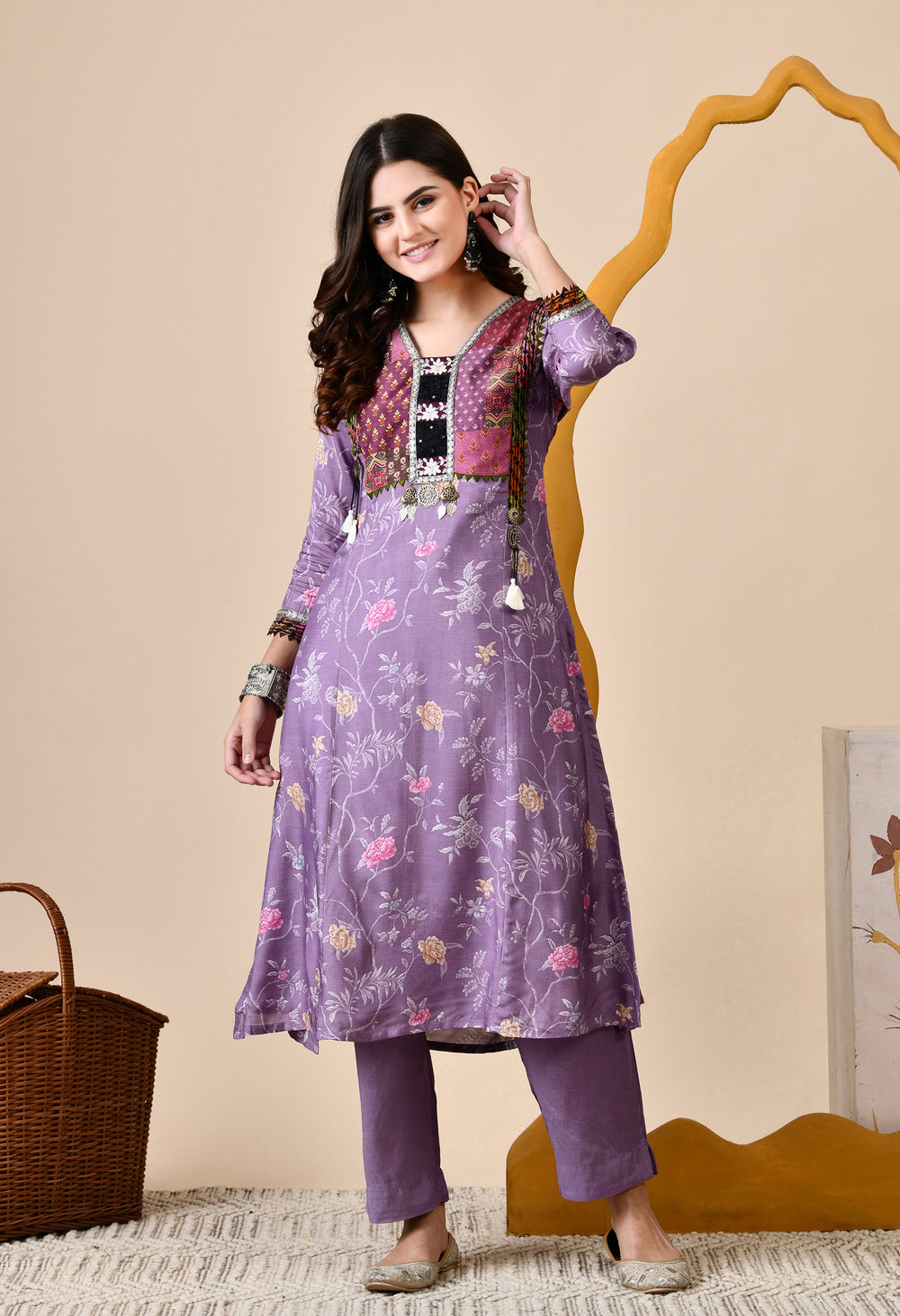 Luxurious lavender Pure Muslin Silk Set, featuring a stunning banarasi patch work detailing on the Neckline, this exquisite set is further elevated by delicate tassels that add a touch of elegance. Set includes a beautiful A-line kurta and smart pants.