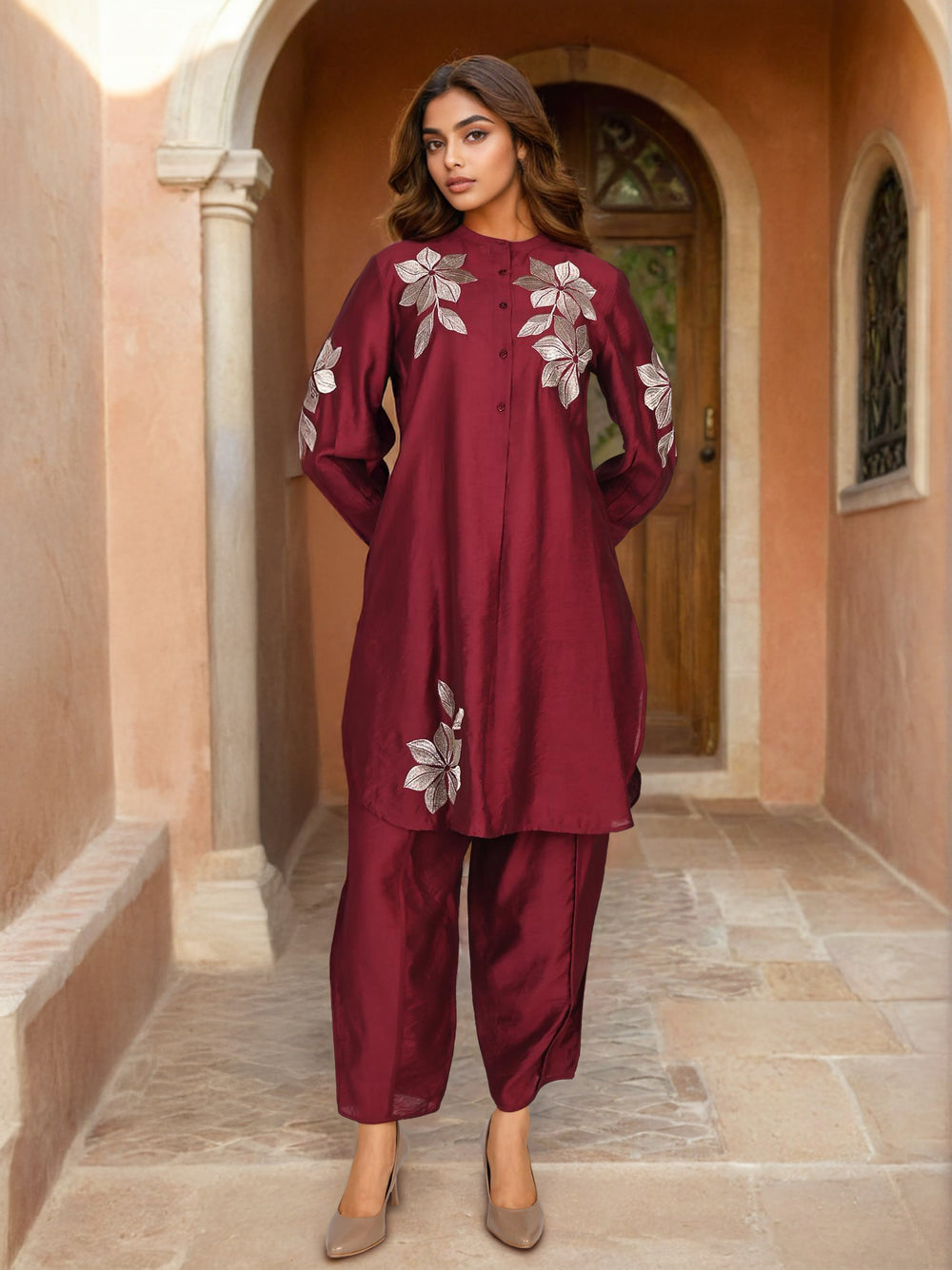 A maroon cotton silk Indo-Western set with zari embroidery is a stunning outfit for festive occasions like Diwali parties, birthday parties, or cocktail functions.