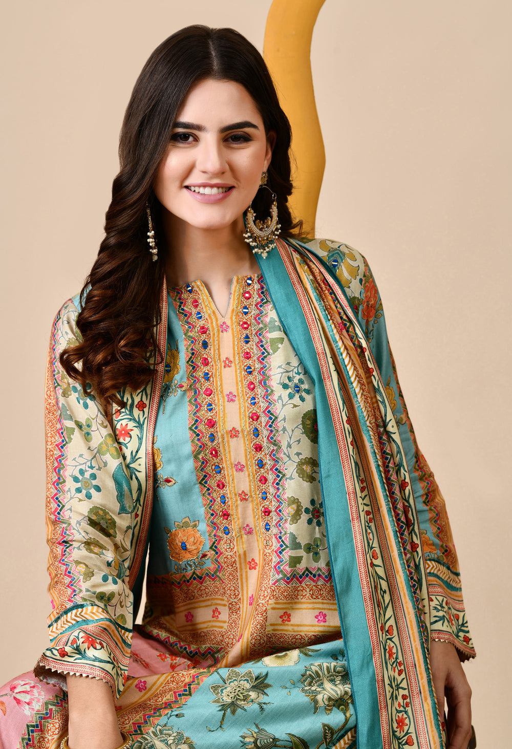 Blue Muslin Digital Print Embroidered Suit - Set of 3