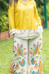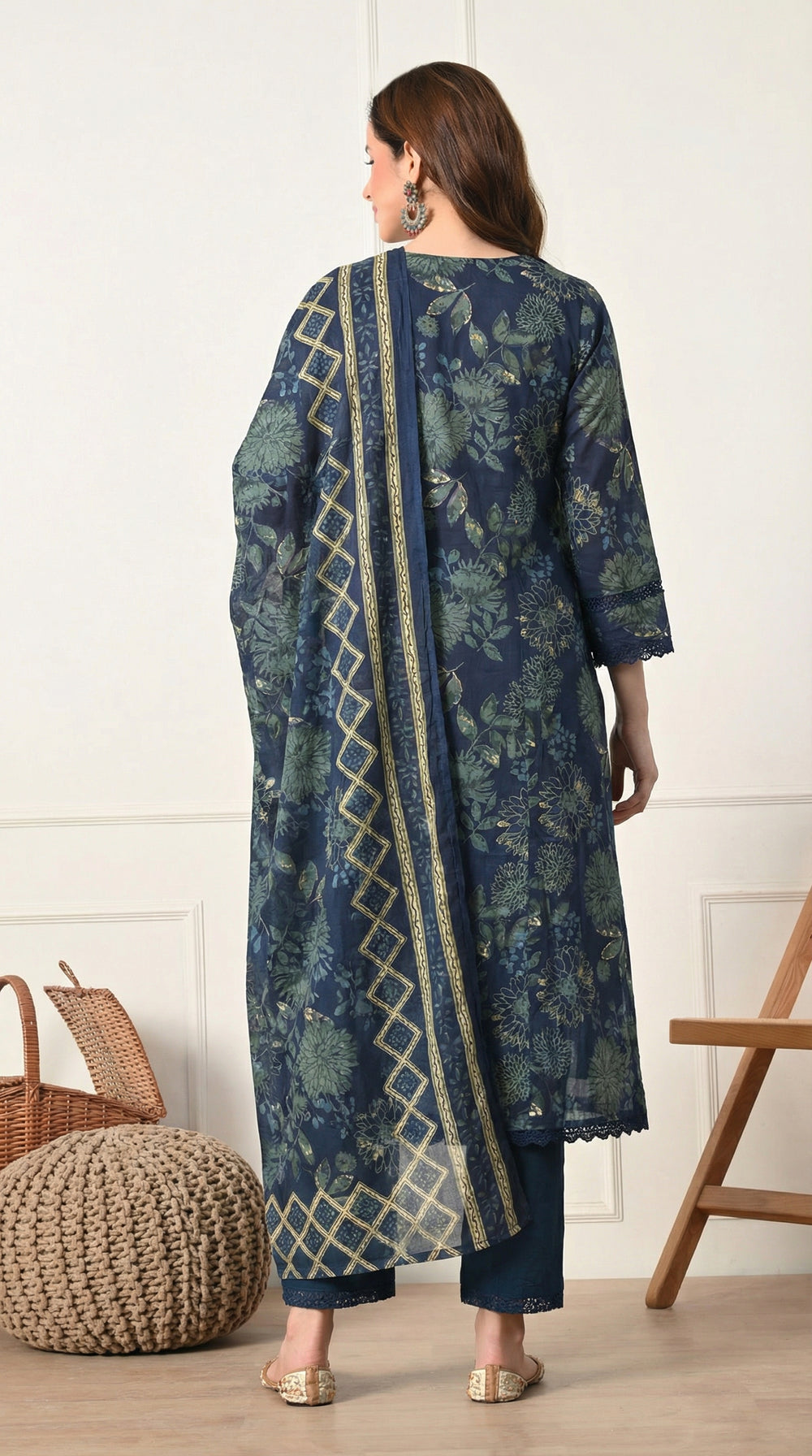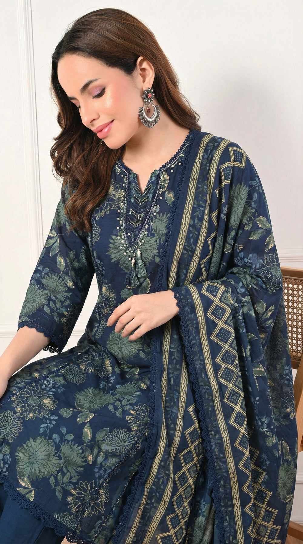 Description Stay cool and stylish in this Navy Blue Floral Cotton set, perfect for casual outings or daily wear. The kurta features a relaxed fit with a large, artistic botanical print in shades of sage and teal, accented by a charming tie-up neckline with tassels. The ensemble is completed with solid navy pants and a matching printed dupatta that features a contrasting geometric diamond-patterned border.