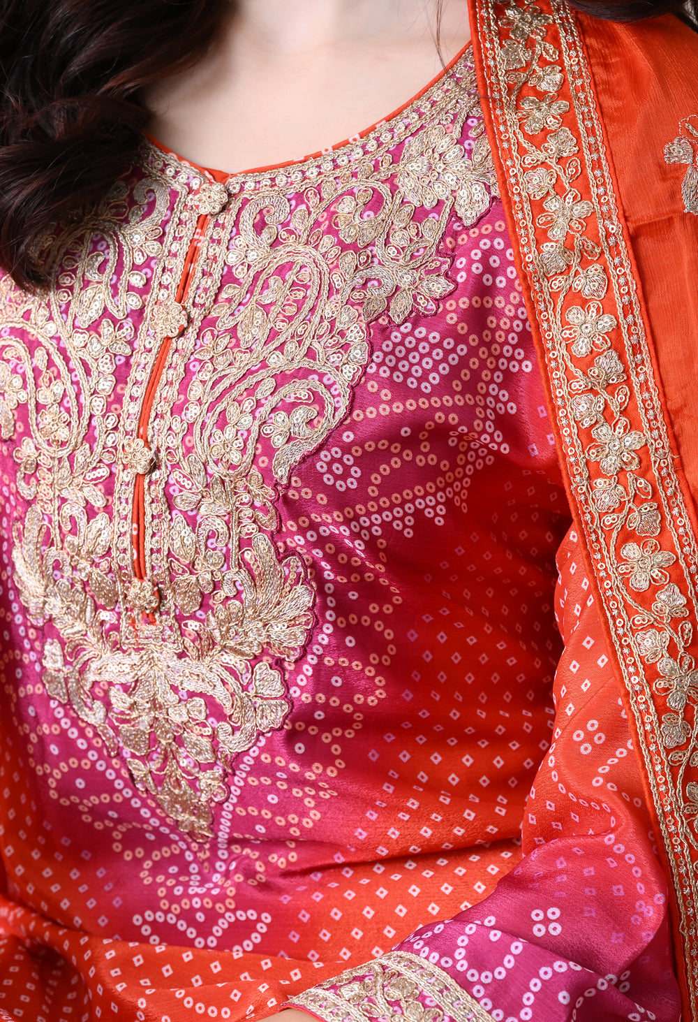A gorgeous Orange Pink Chinon Bandhani Print Zari Embroidered Suit features: