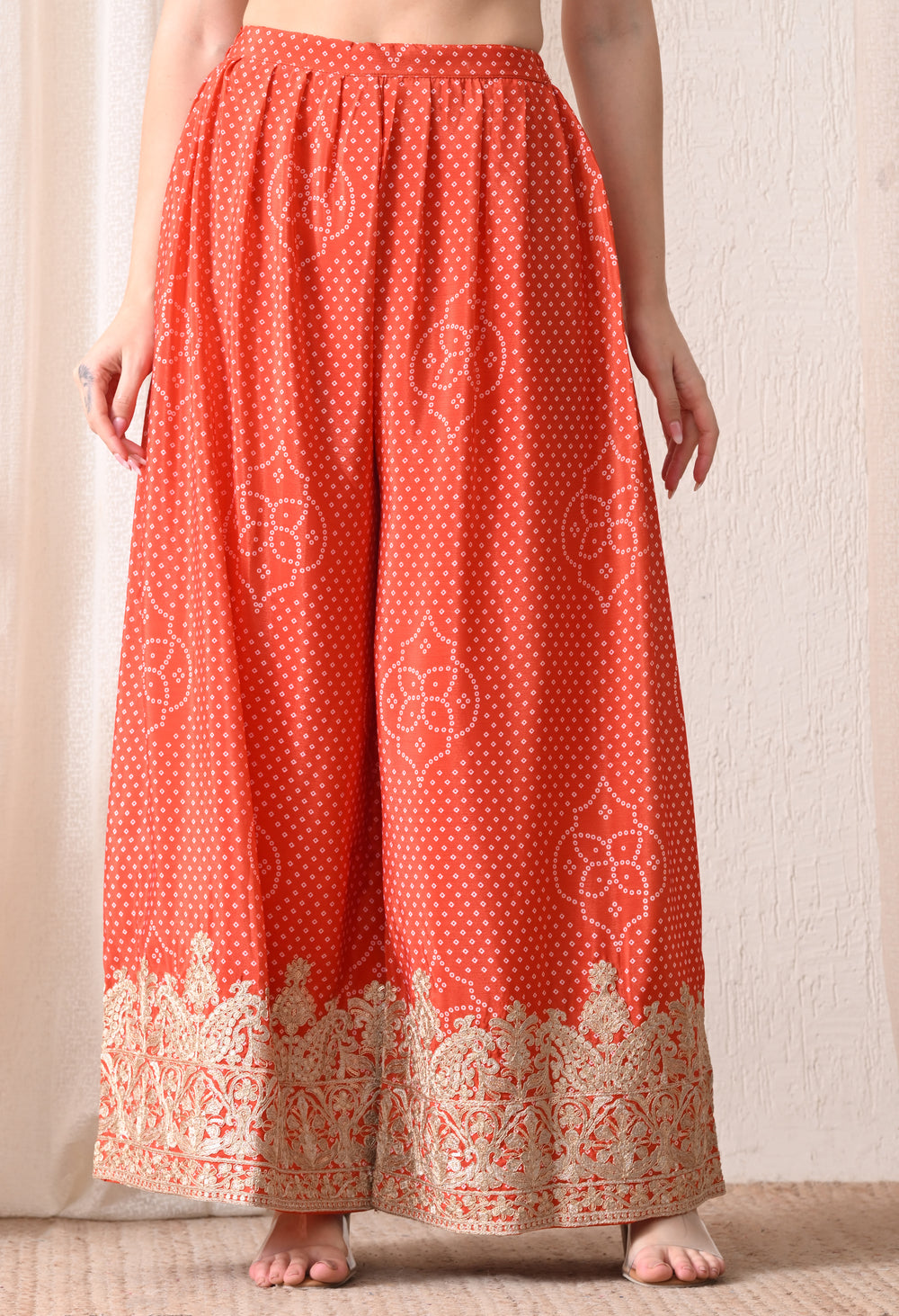 - An orange pink suit with a beautiful bandhani print that enhances its beauty and gives a traditional touch.