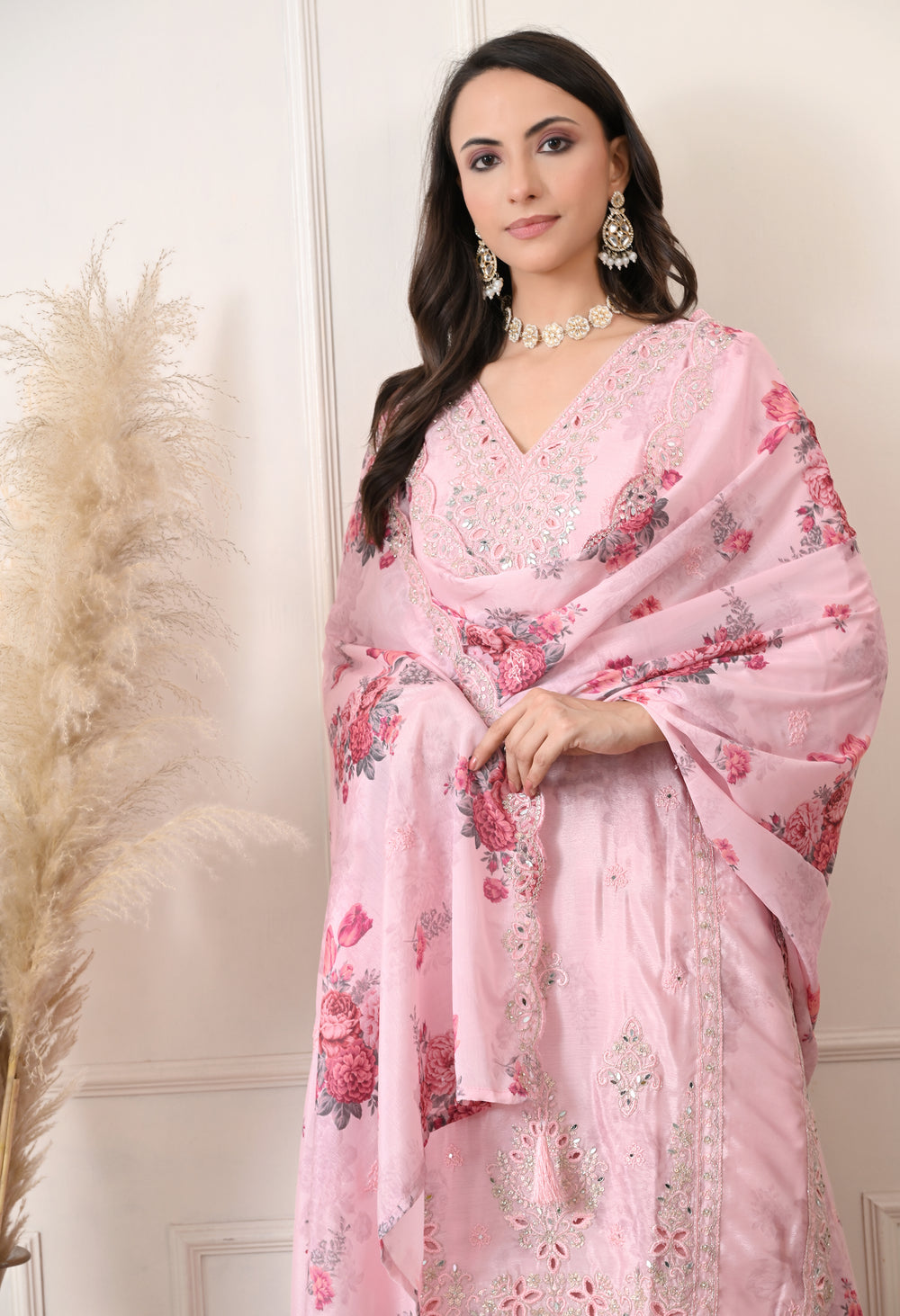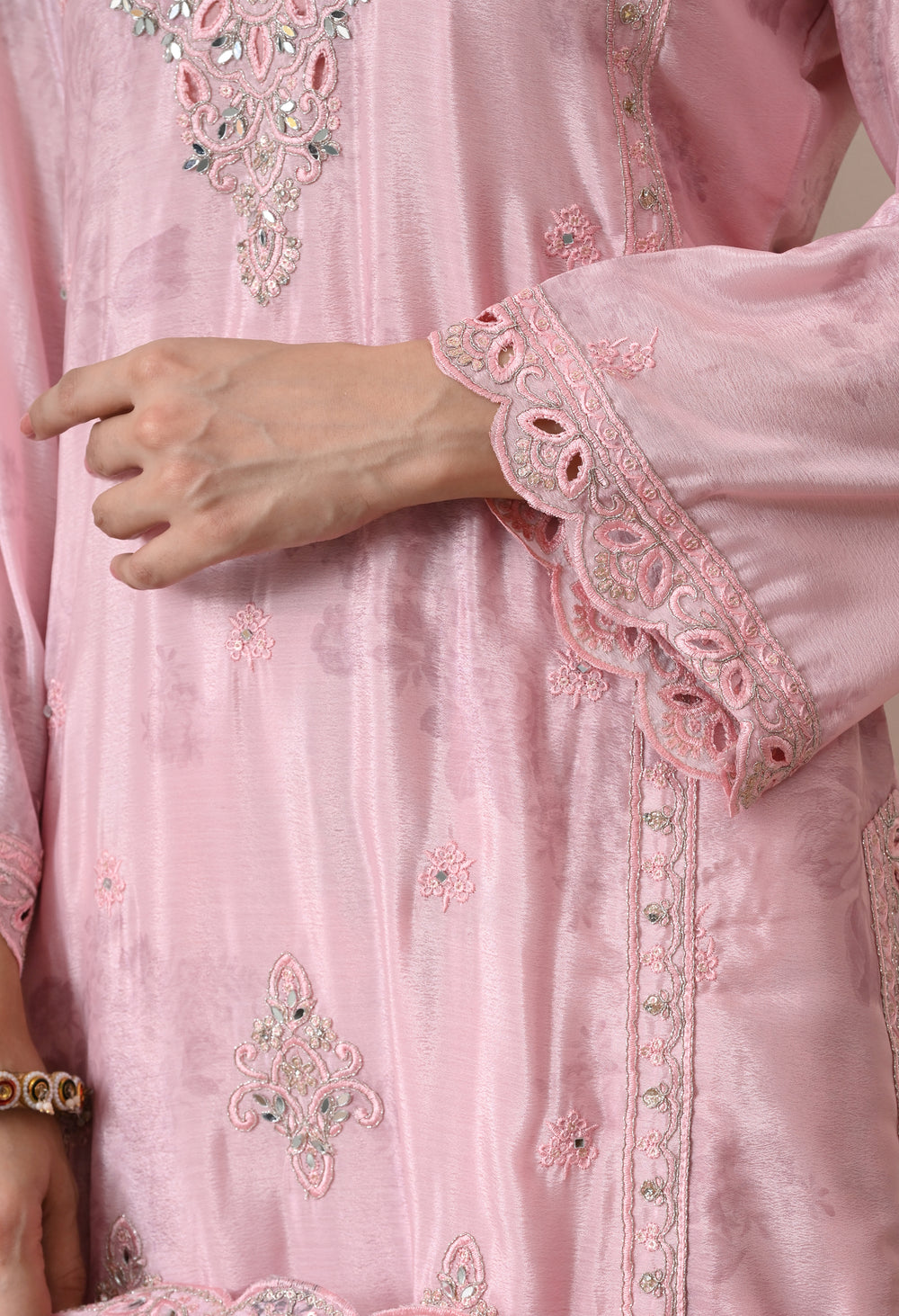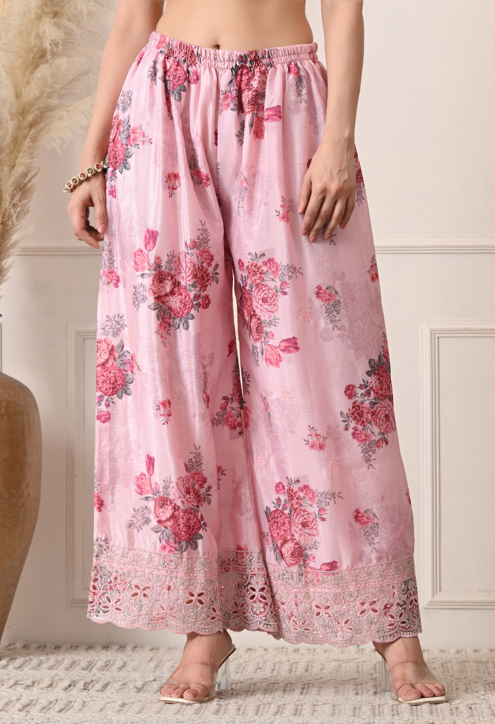 Pink Chinon Zari Mirror Cut Work Floral Sharara Suit- Set of 3