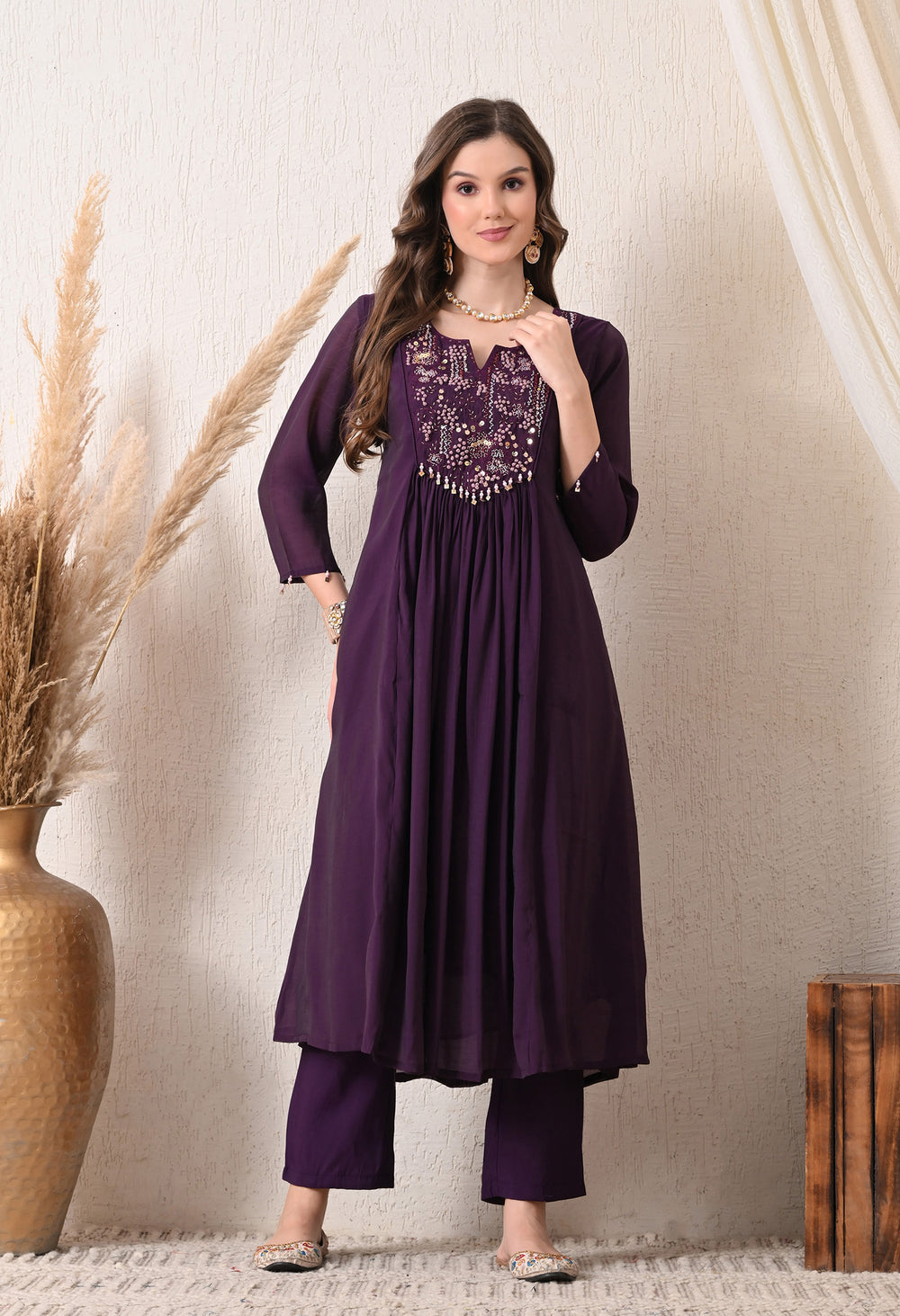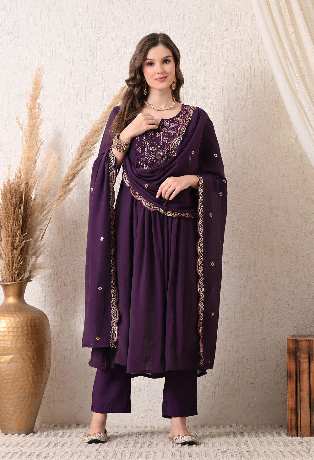 Set includes an anarkali kurta Paired with smart pants and a dupatta, this vibrant purple ensemble is sure to turn heads. Whether it's a wedding, festival, or formal event, this Anarkali suit's classic design and vibrant color make it an excellent choice, effortlessly combining style and comfort.