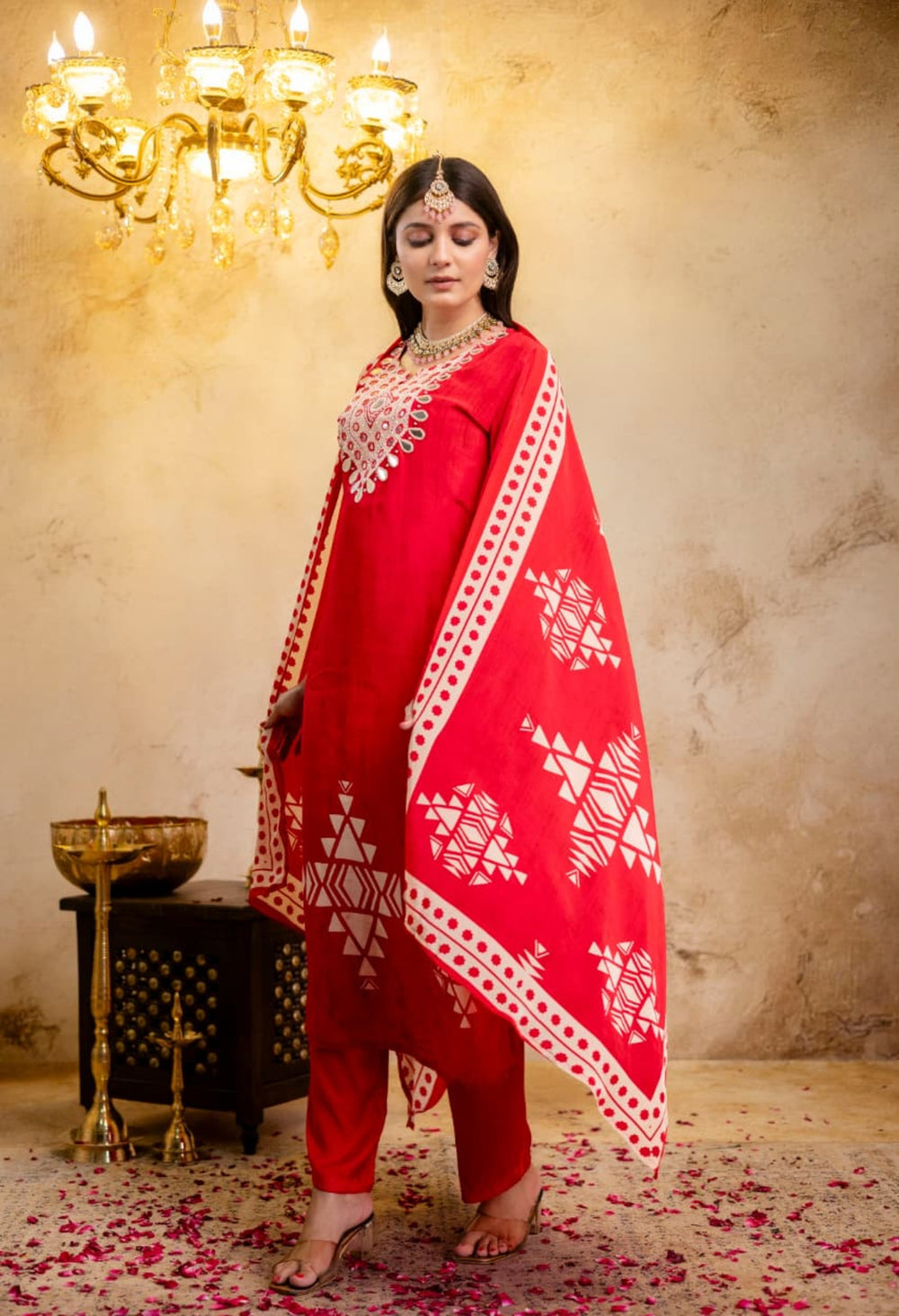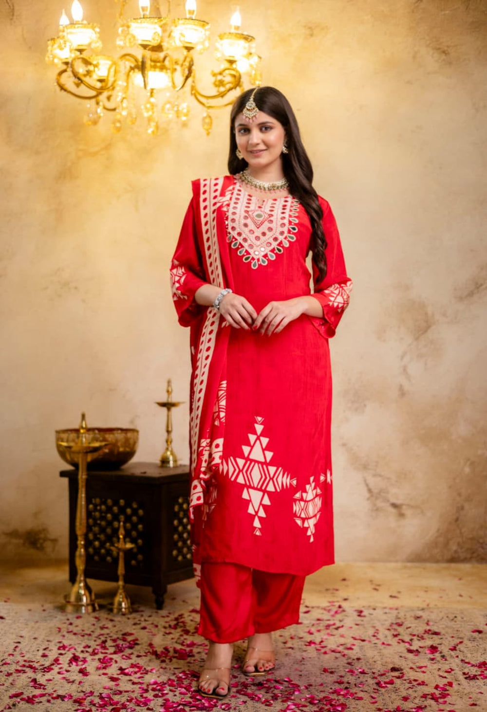 Red Crepe Digital Print Mirror Work Suit - Set of 3