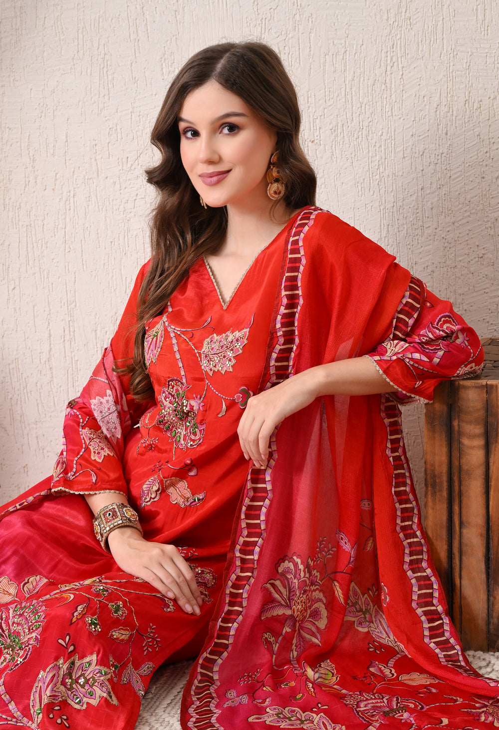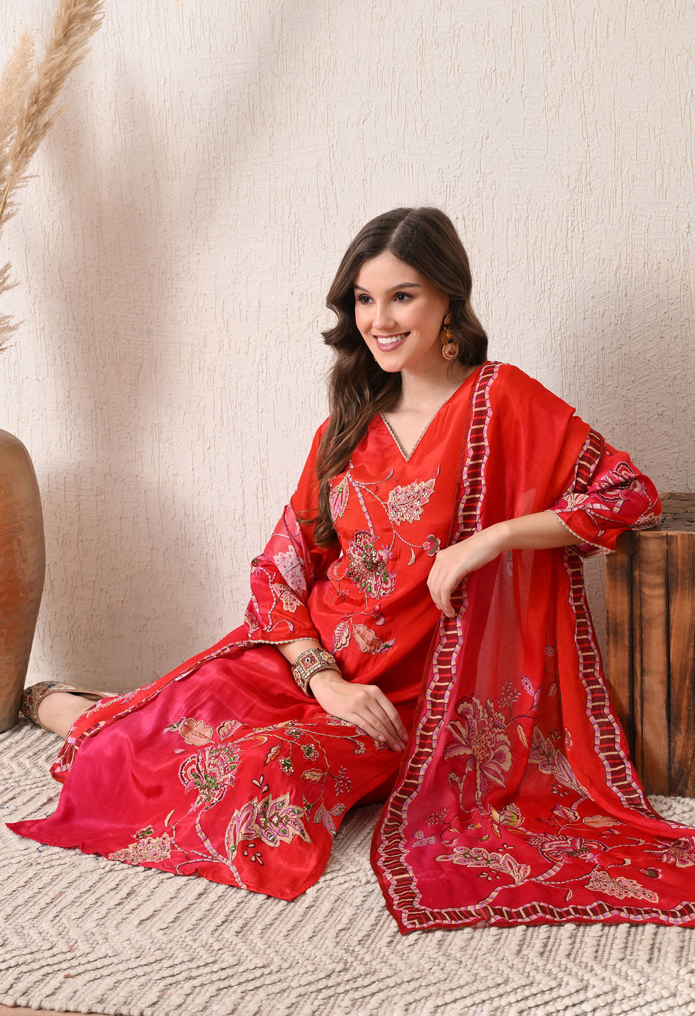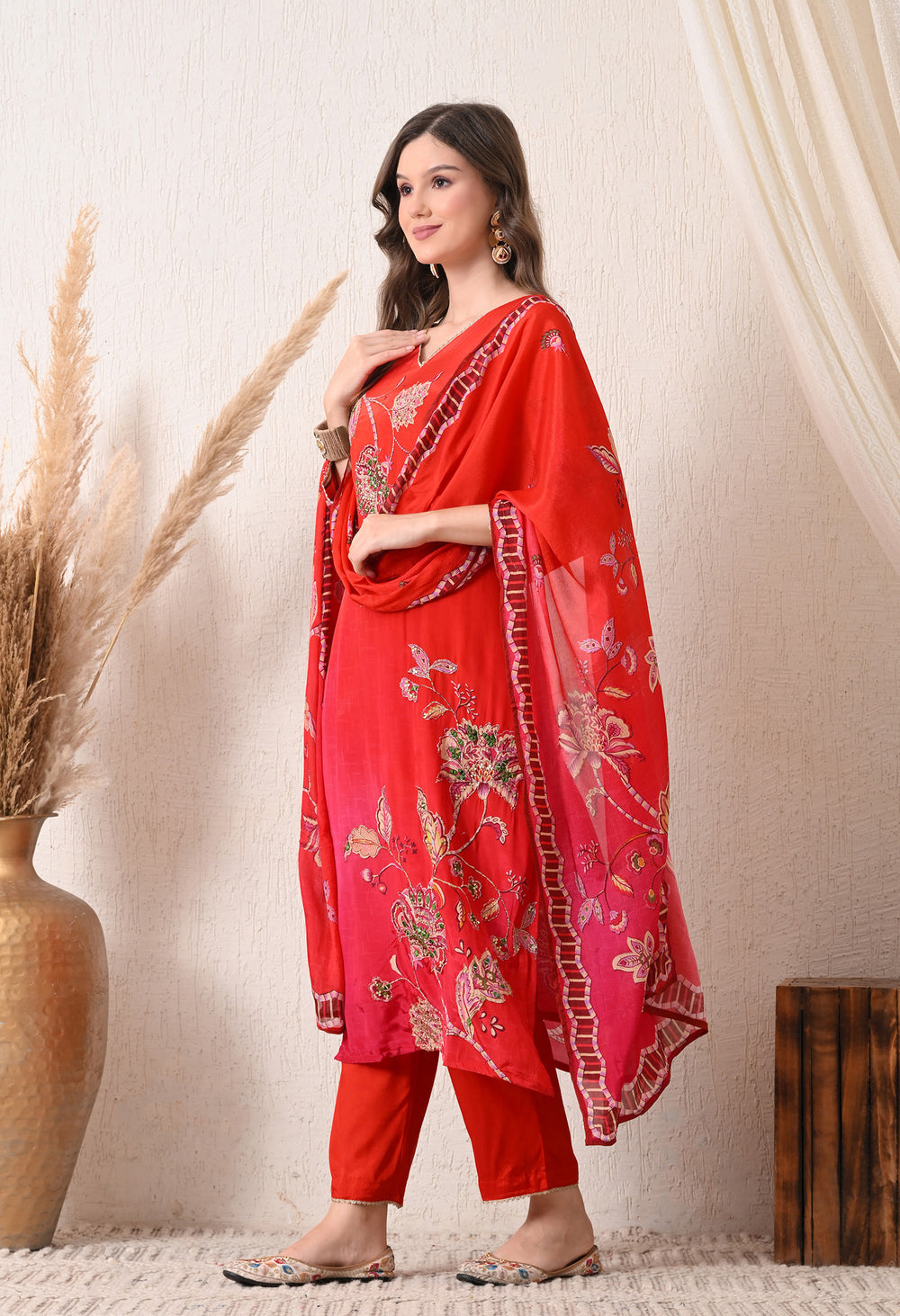 Red Magenta Ombre Crepe Embroidered Suit - set of 3