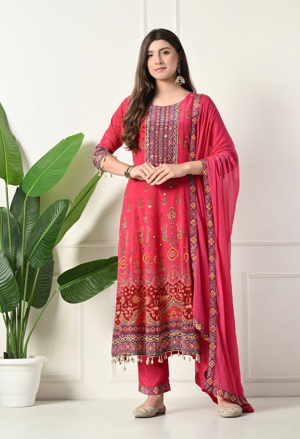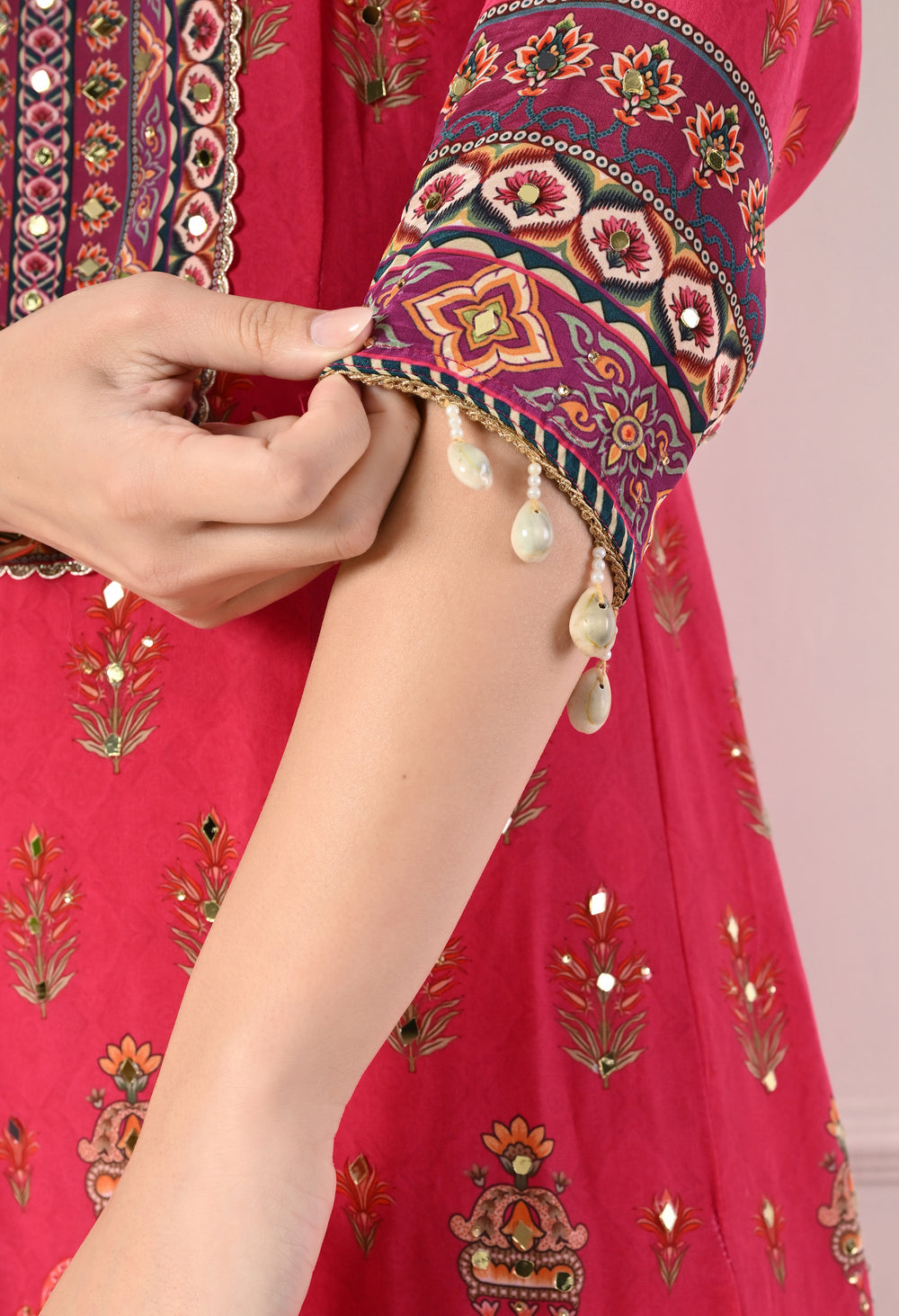 Ruby Red Crepe Digital Print Mirror Work Anarkali Suit - Set of 3
