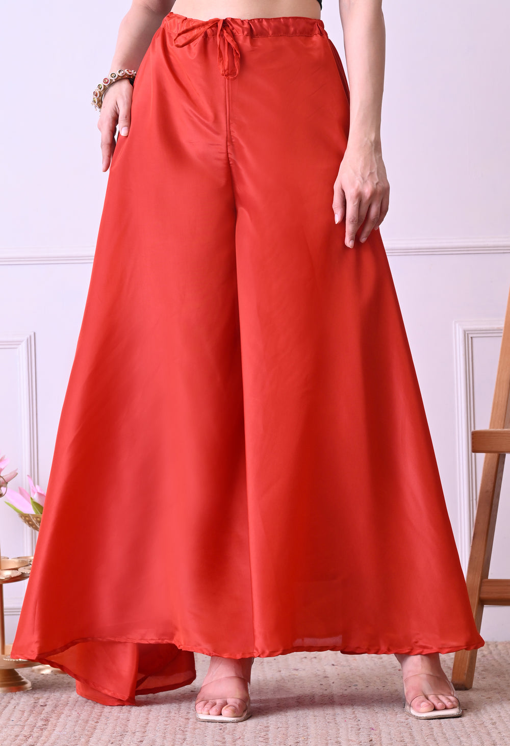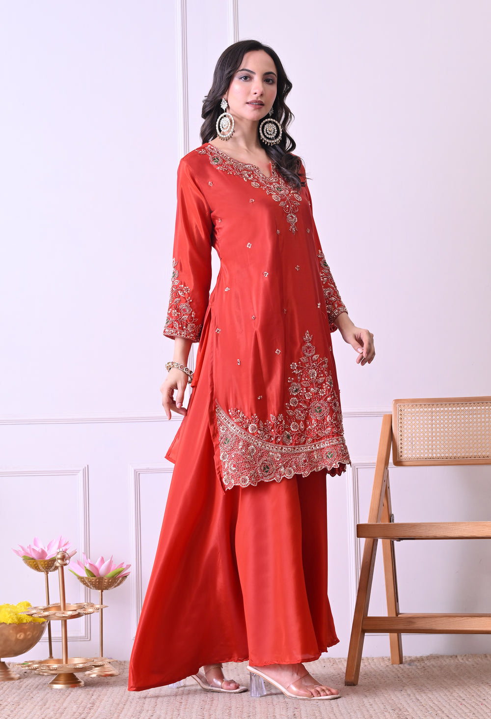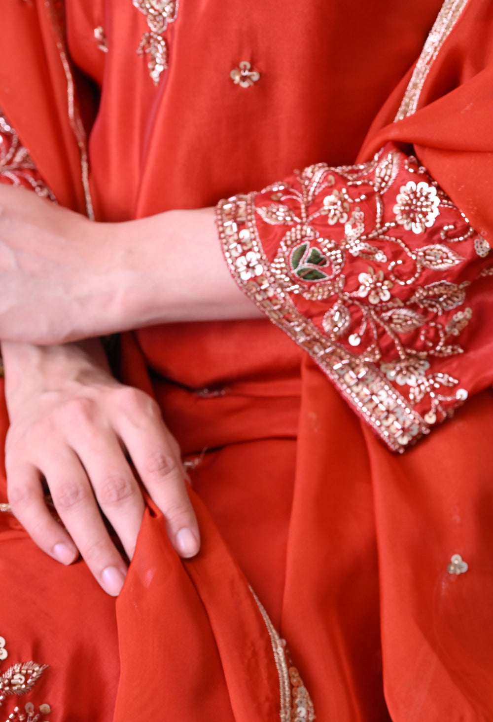 A stunning rust‑orange crepe sharara suit made from super‑soft fabric with an attached mul lining for added comfort. The kurta features beautiful hand‑embroidered beads, sequins, and zari work, while the dupatta is embellished with sequin embroidery. The set includes a matching sharara pant, making it an outstanding piece for any occasion.