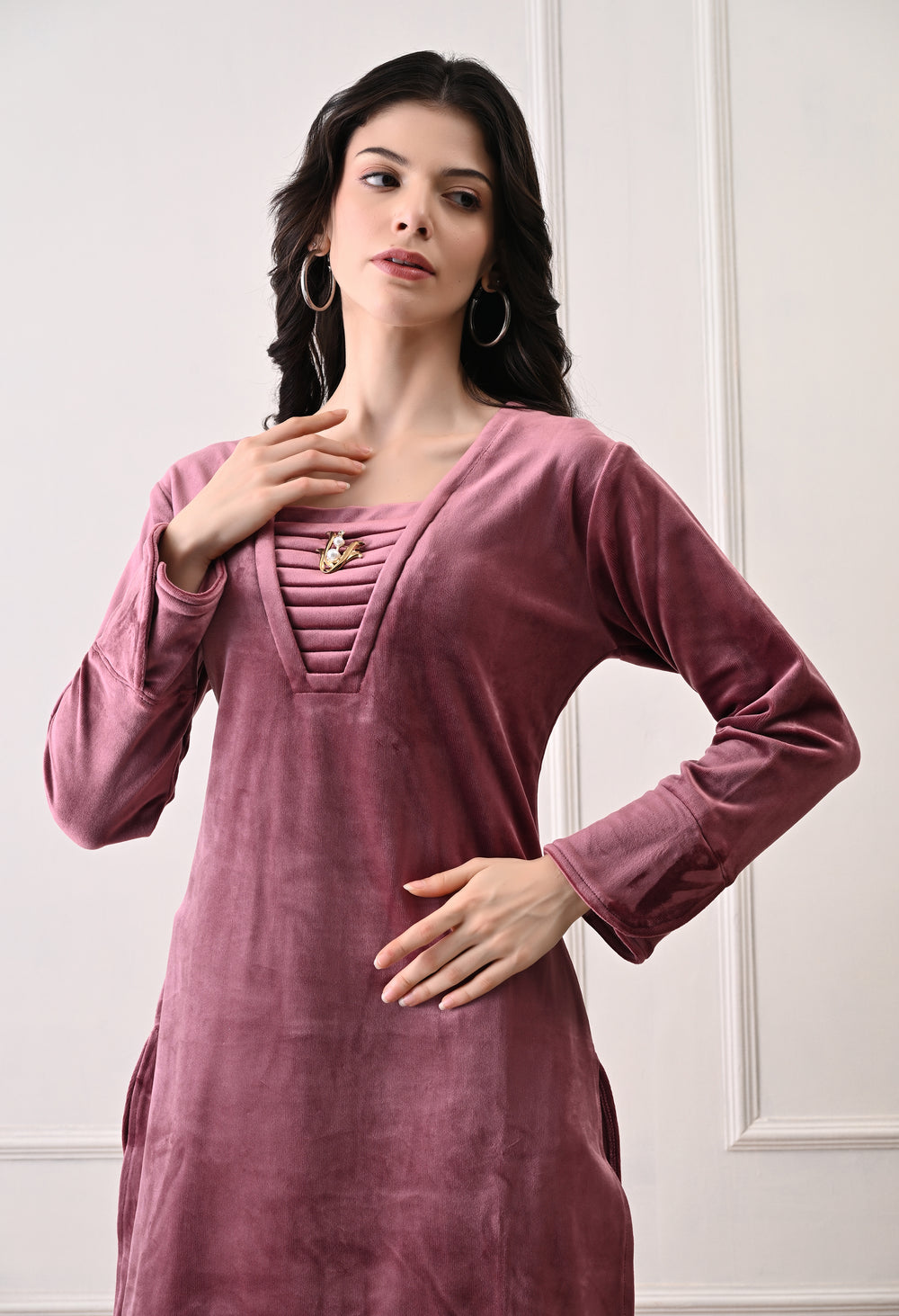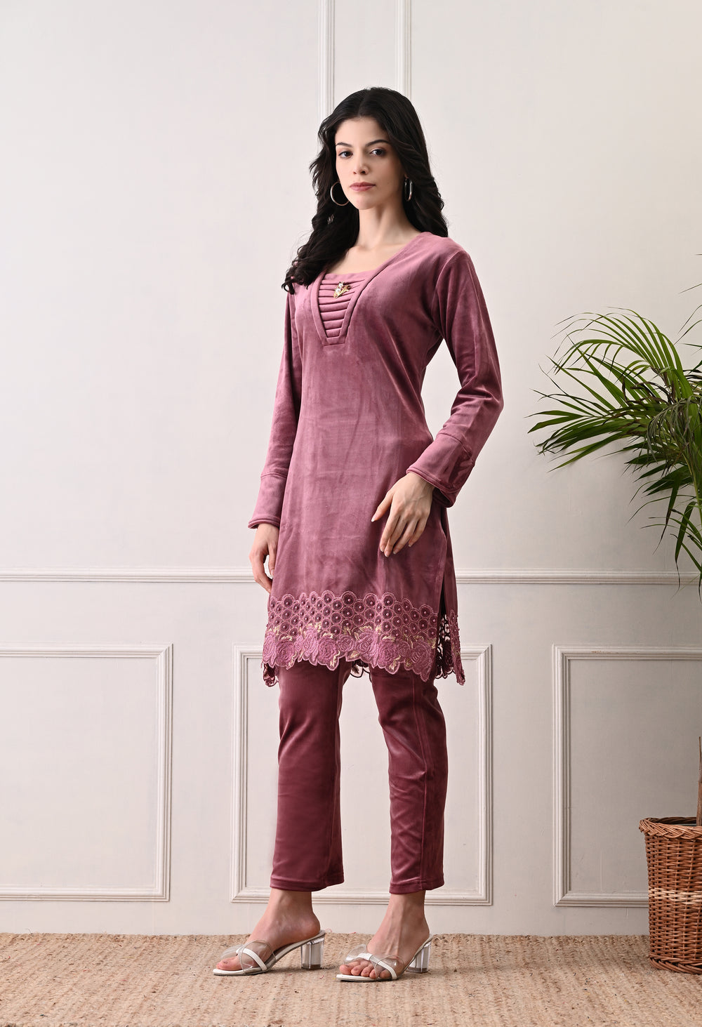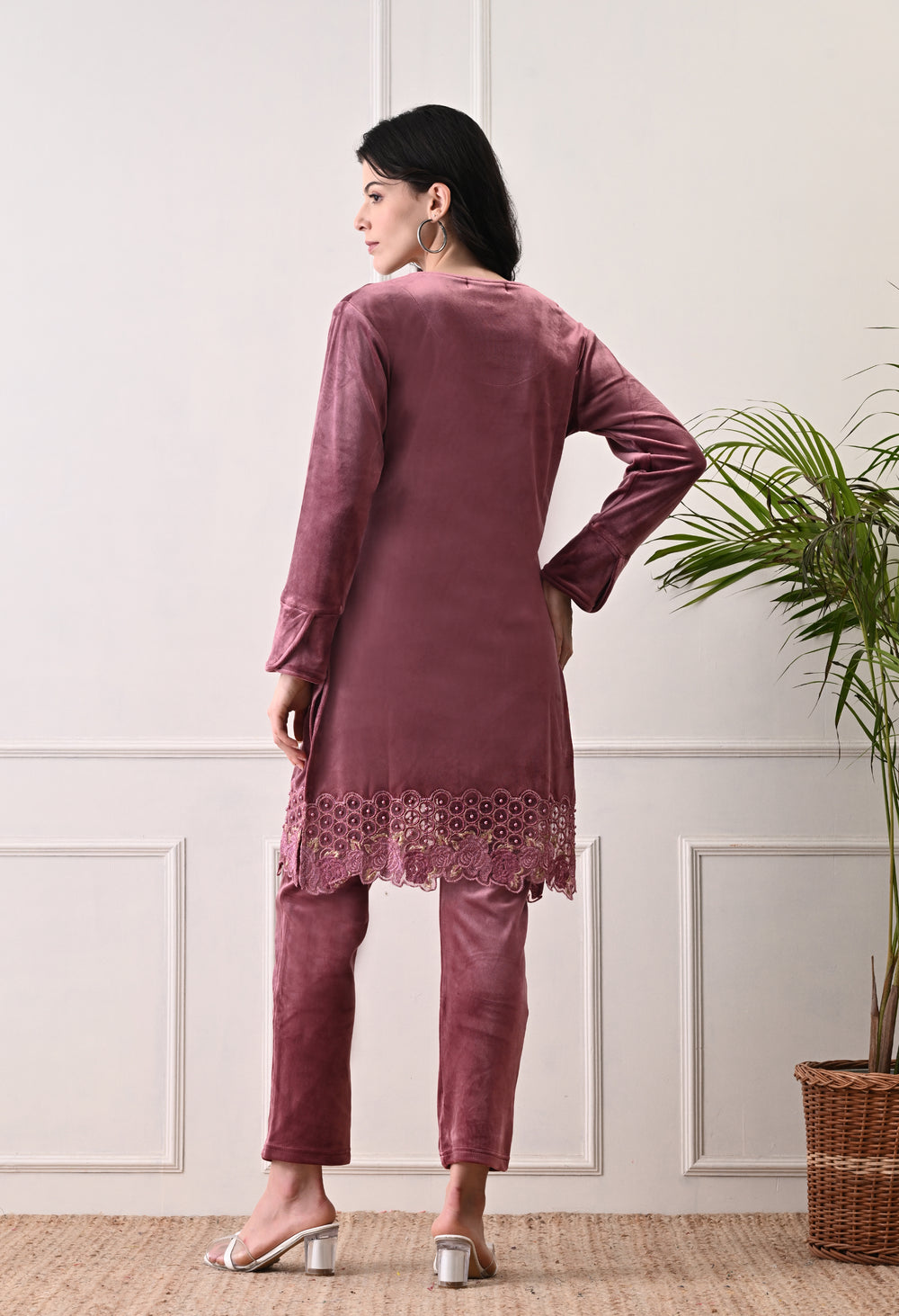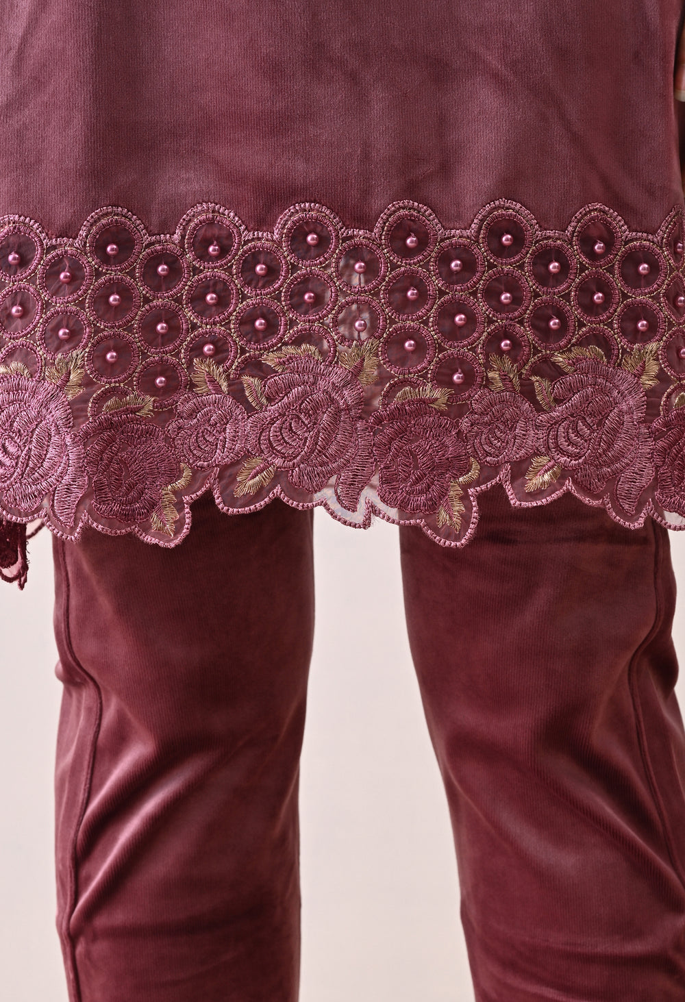 This is a luxurious velvet coord set that feels very smooth and soft. It’s cozy and warm, making it perfect for any occasion. The set has a beautiful organza border with beads and patchwork details.