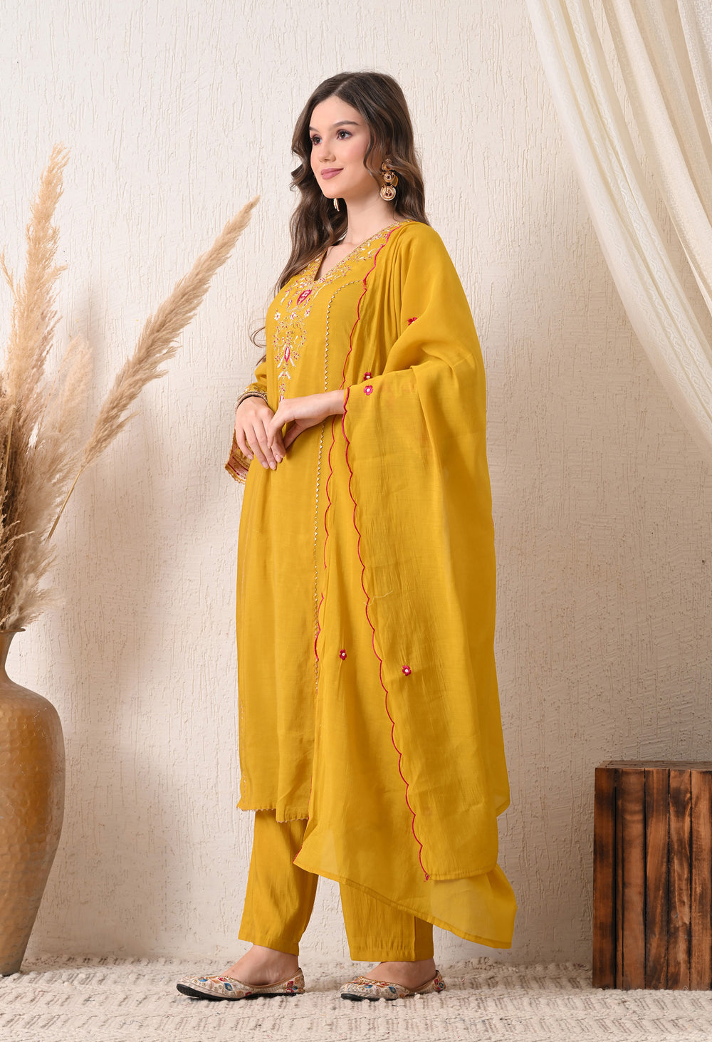 Perfect for special occasions or formal events, this suit's vibrant yellow hue and exquisite embroidery make it a head-turner. The mul Chanderi fabric adds a touch of luxury, ensuring you feel regal and refined. Whether you're attending a wedding, festival, or formal gathering, this suit is sure to make a lasting impression.